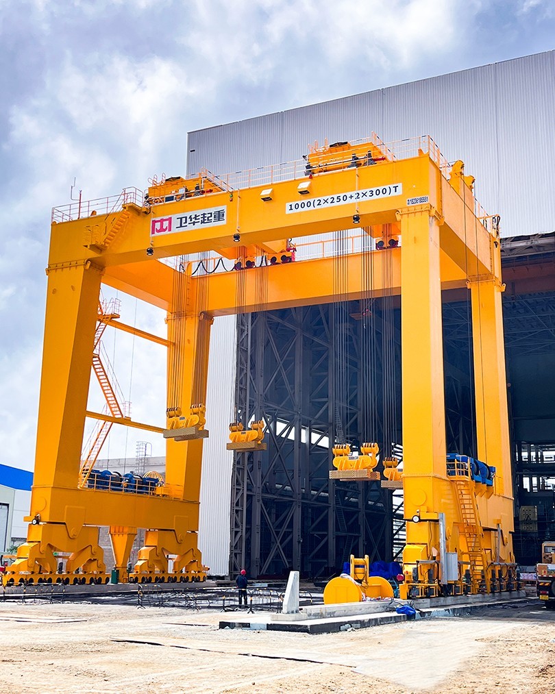 根据项目起吊重量大、工况复杂、控制精度高等特点,hth·华体起重机采用U型门架结构,双龙门四点吊装,最大起吊重量1000t,最大吊点高度大于18m,采用变频+PLC控制,可实现横向、纵向距离可调,及吊梁自由旋转,控制精度达±1mm。